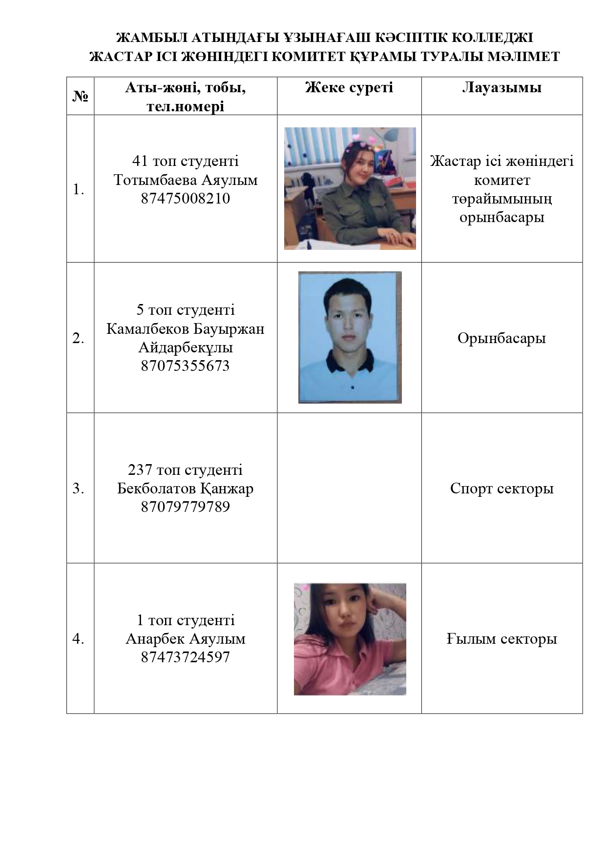 "Алматы облыстық білім басқармасы" мемлекеттік мекемесі "Жамбыл атындағы Ұзынағаш кәсіптік колледжі" МКҚК